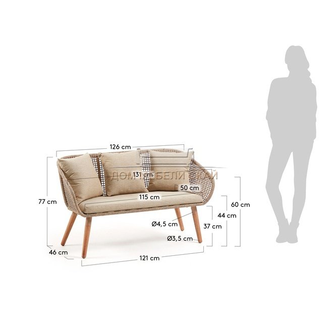 | Материал каркаса дивана | натуральный и долговечный массив эвкалипта, 4 слоя защитного лака от ультрафиолетового излучения, спинка и боковины выполнены плетением полиэфирной веревкой | |||